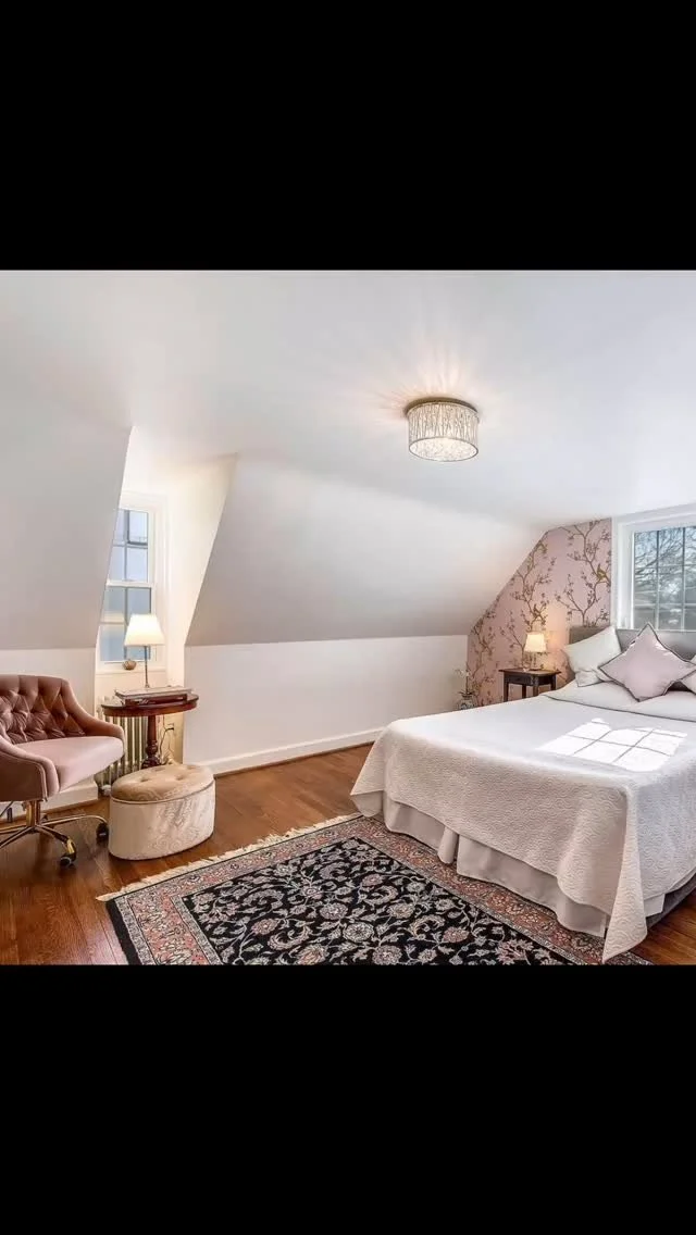 ![Cozy bedroom with a large bed, white bedding, and decorative pillows. Light gray walls, hardwood floor, ceiling fan, and three windows with blinds. White nightstands with lamps, an armchair, and artwork on the wall. Area rug with a leafy pattern.]()  Colonial in Friendship Heights DC