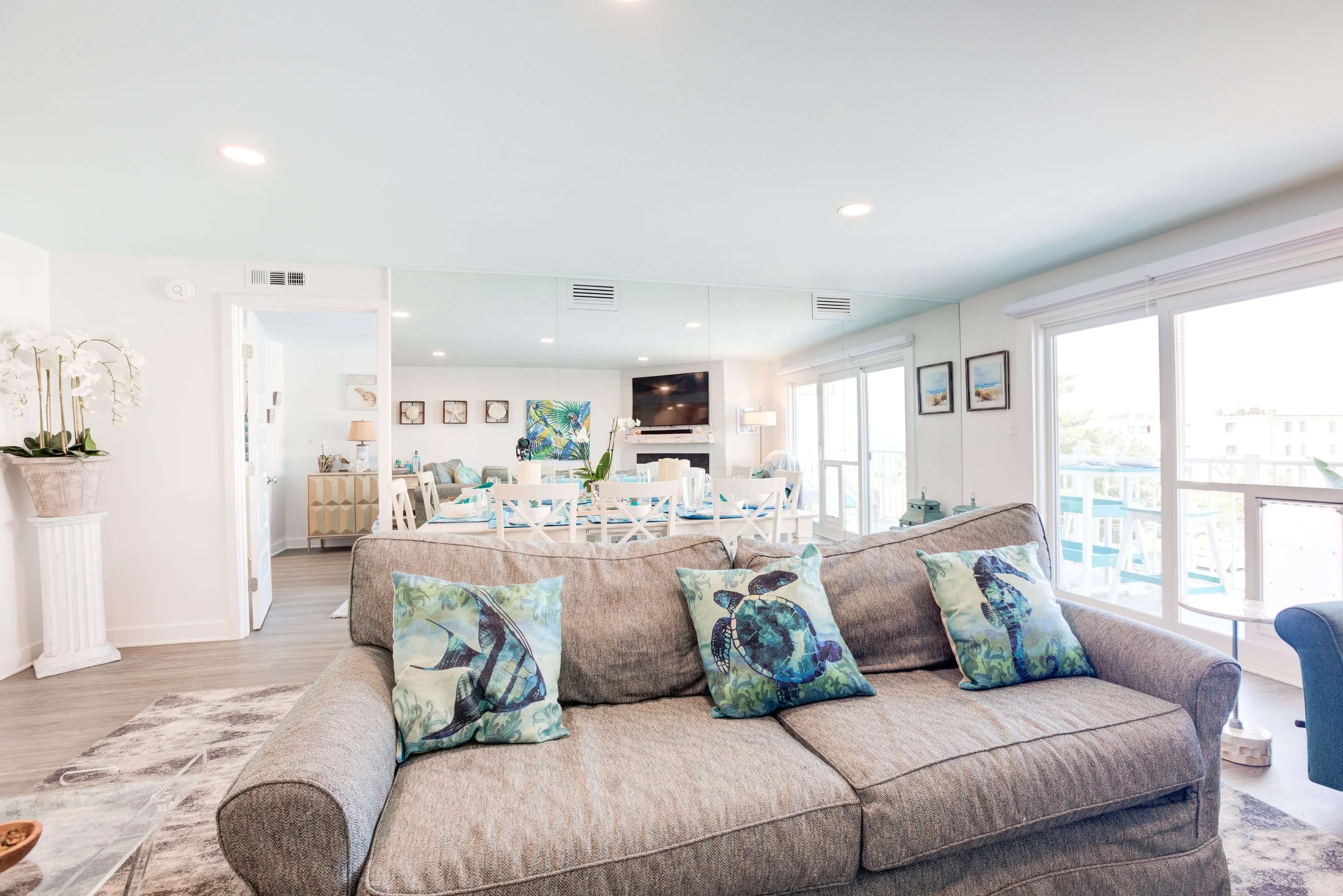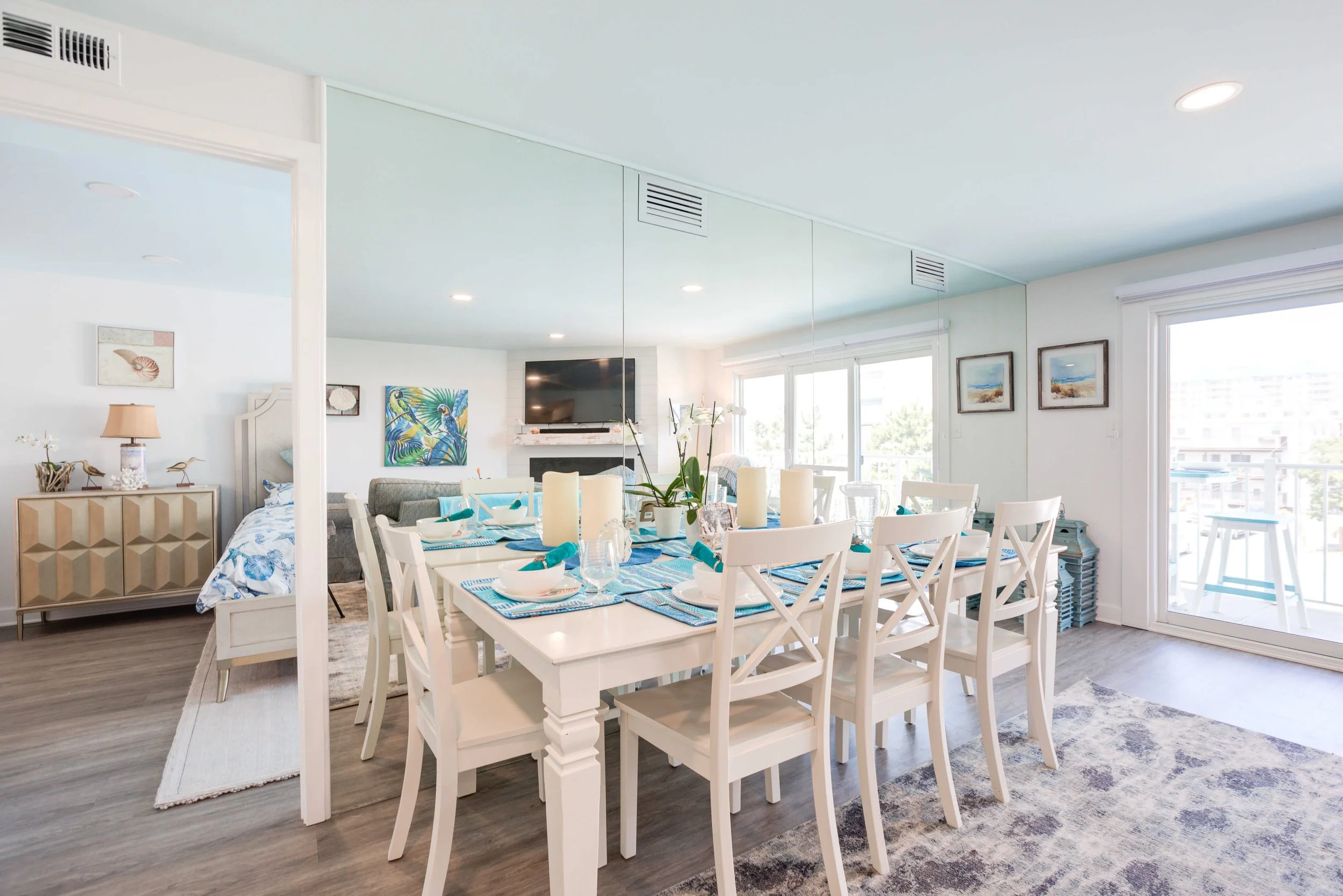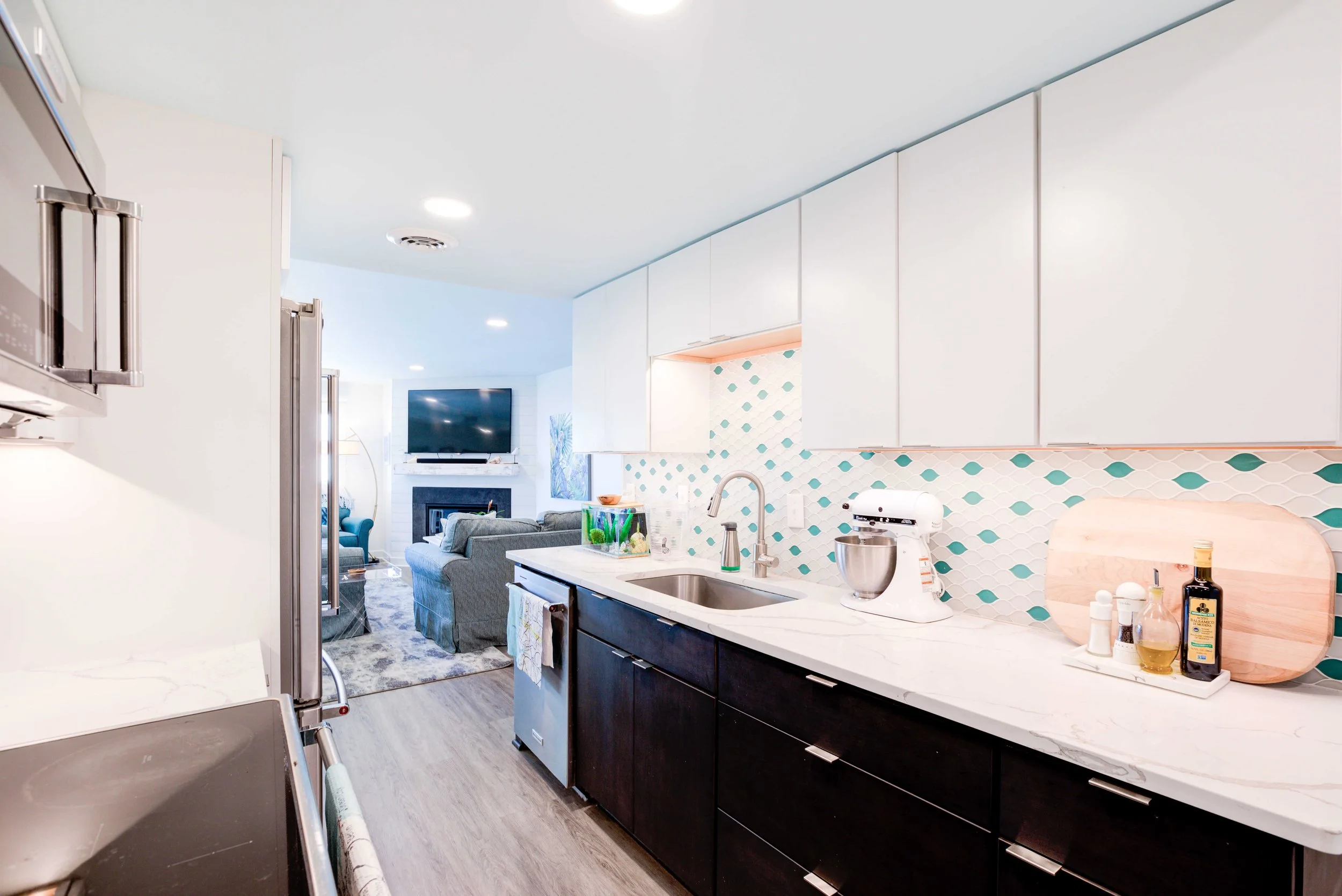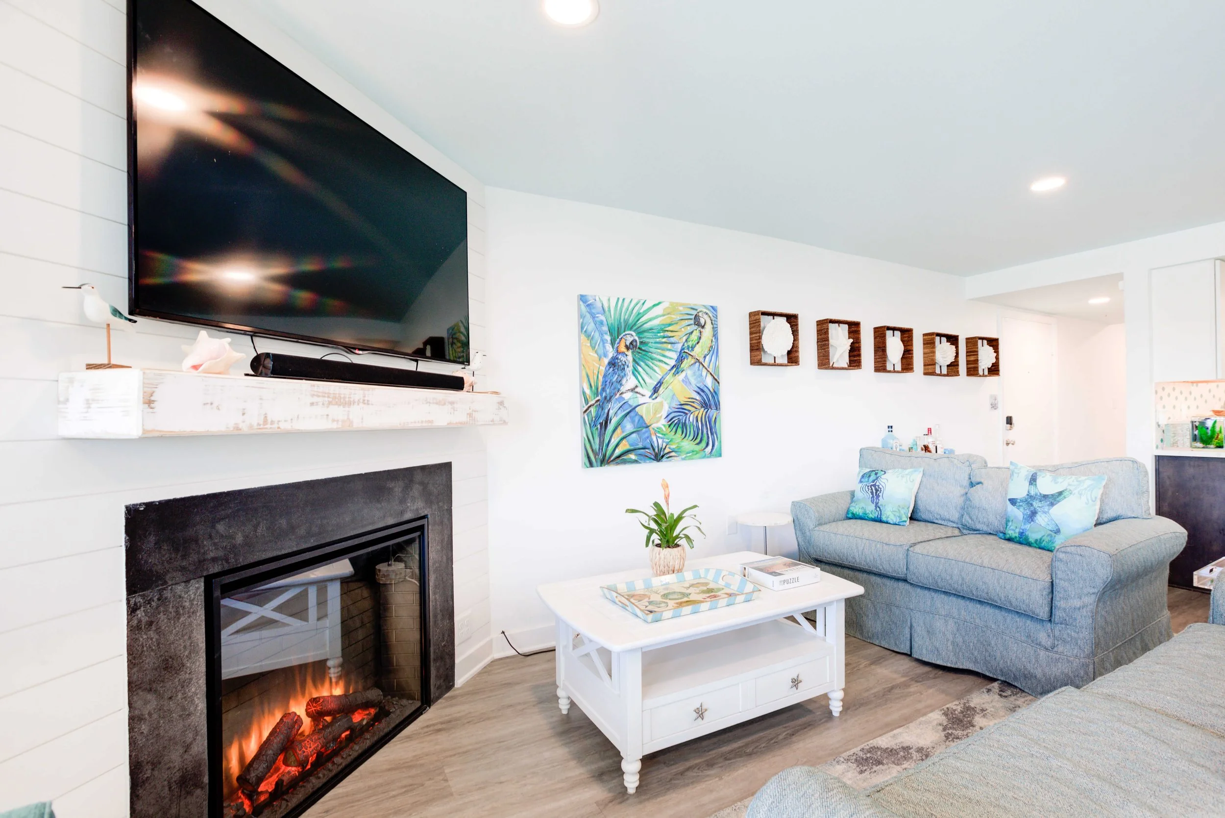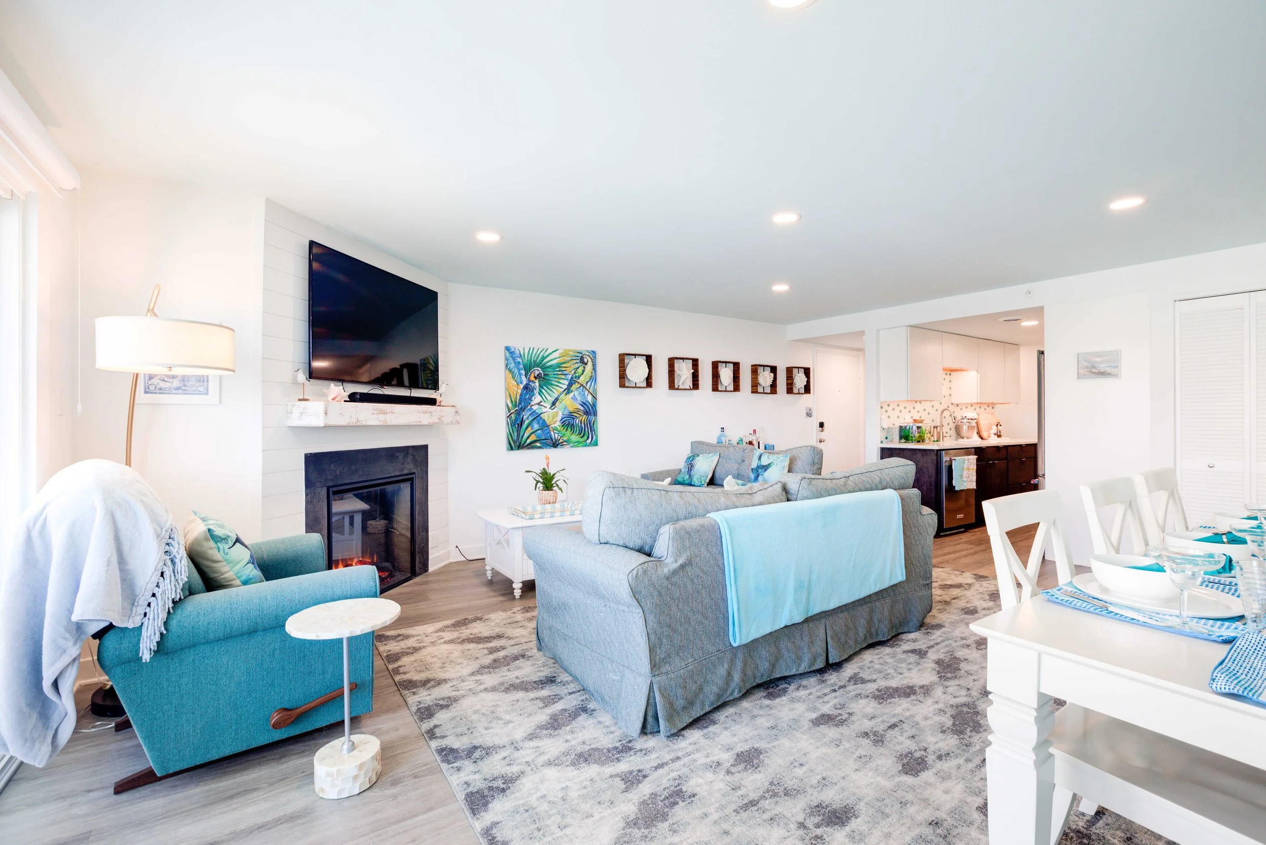 The condo had great bones but the overall dated 80’s vibe needed to go. The entire condo was gutted and a full Reno added new waterproof flooring, a contemporary kitchen and bathrooms, new doors and closets, new fireplace, shiplap and mantel, new window treatments, new furniture, rugs and styling. The main room mirror remained so as to maintain the ocean reflection within and keeping the spacious feeling in the main room. Great midtown location by the ocean and a short walk over to the bayside Fagers’ Island resort. Bright airy white, charcoal and turquoise coastal accents.