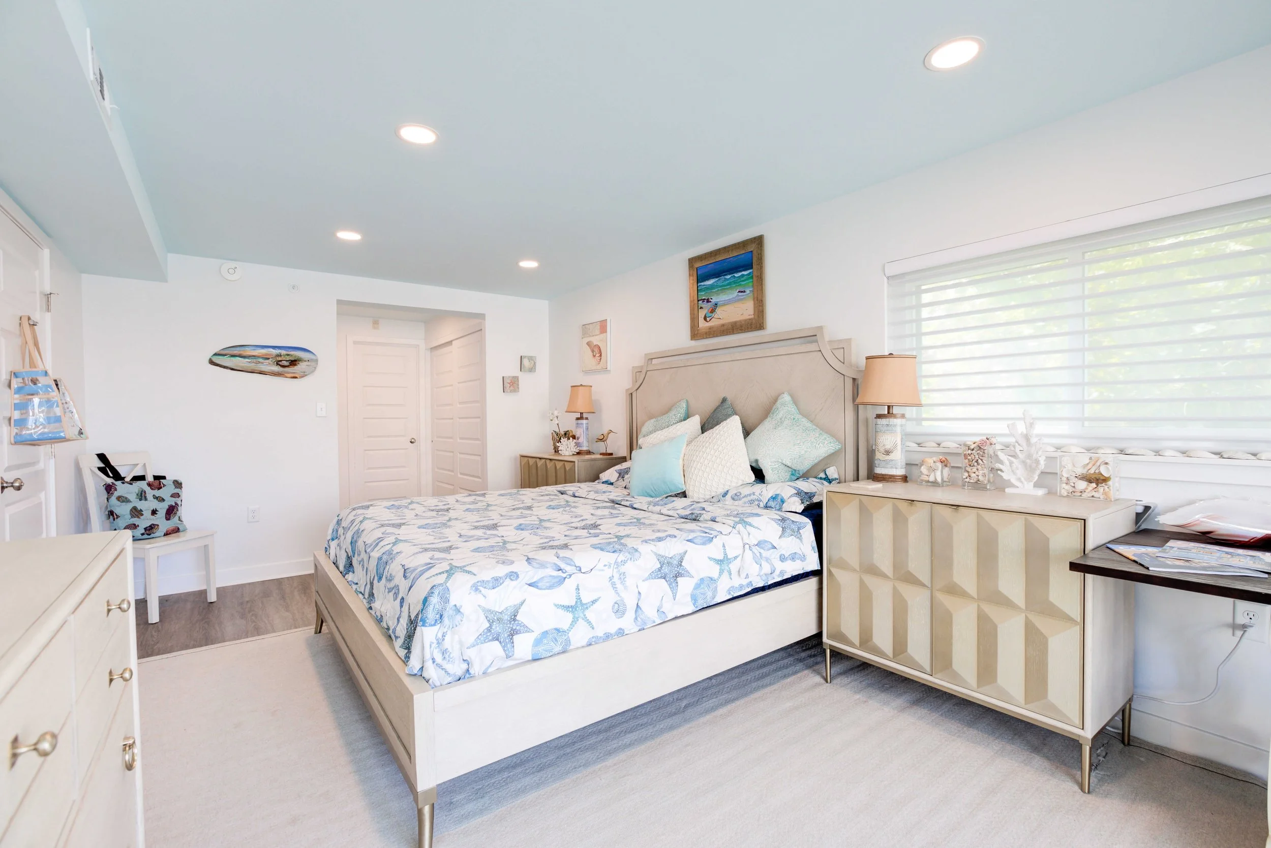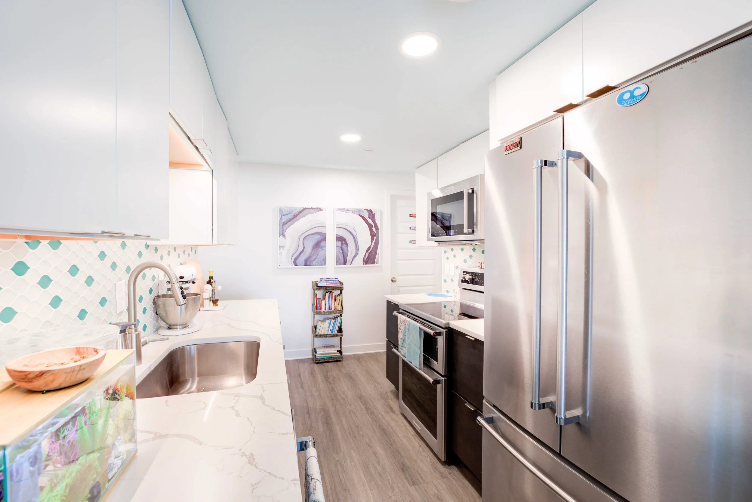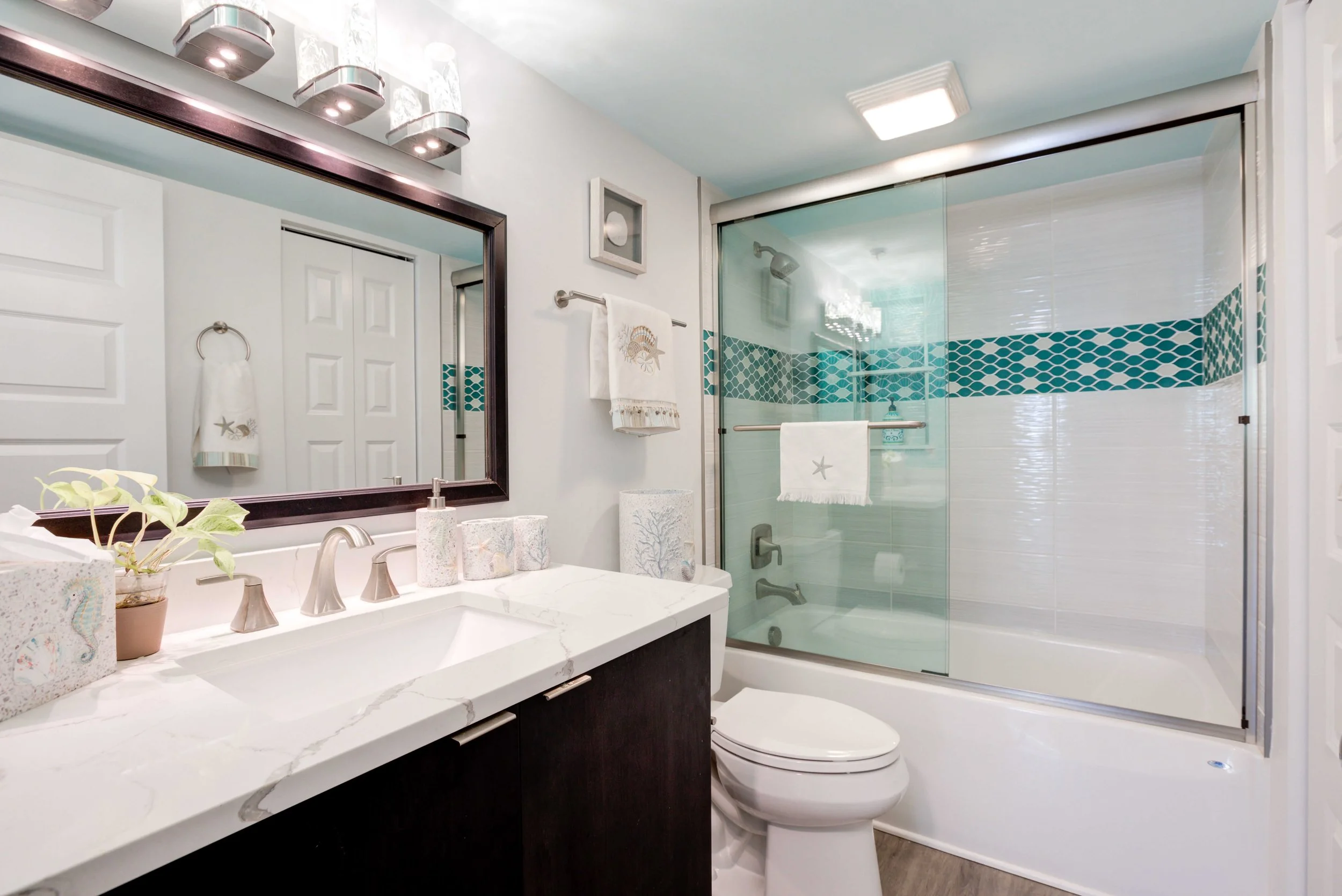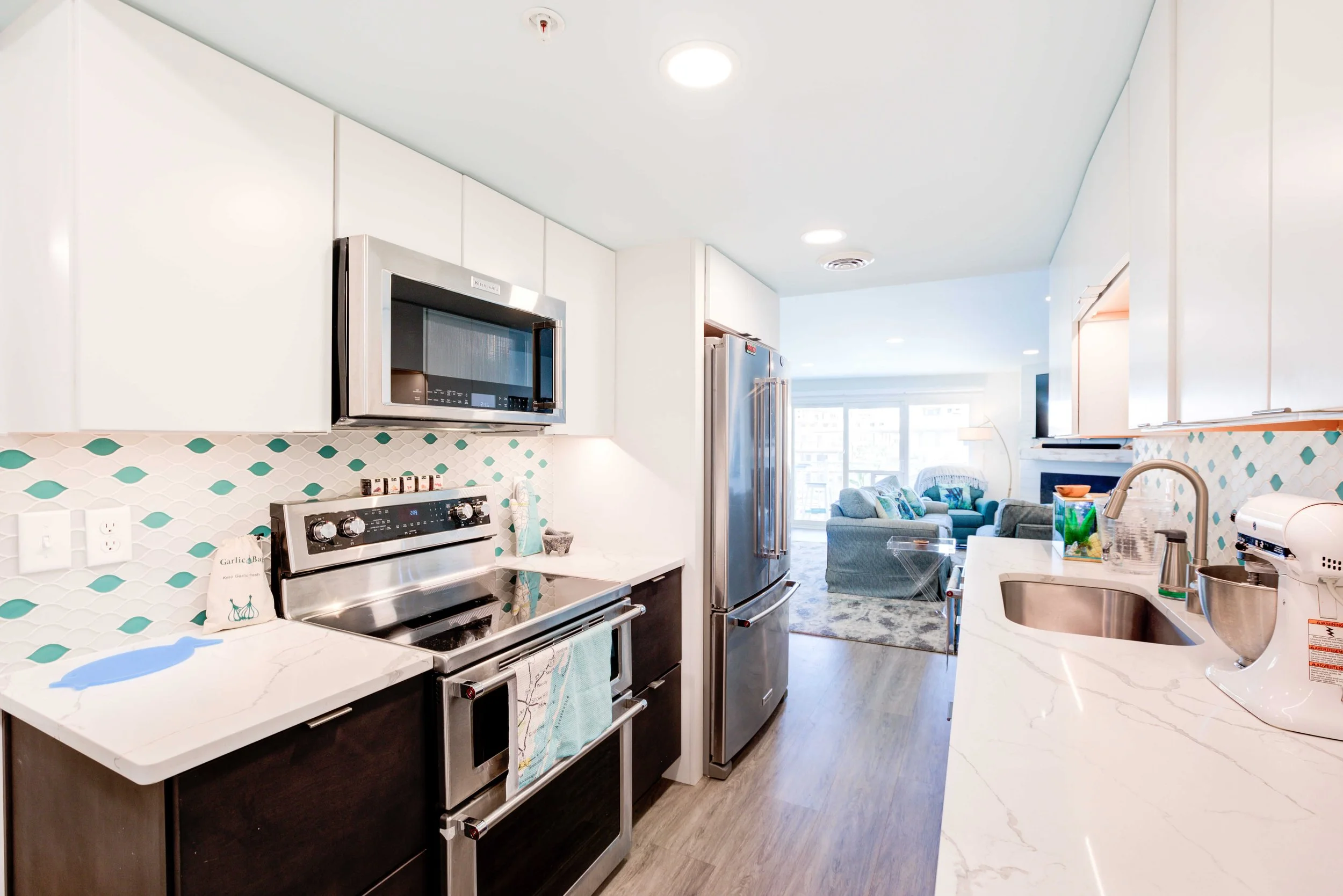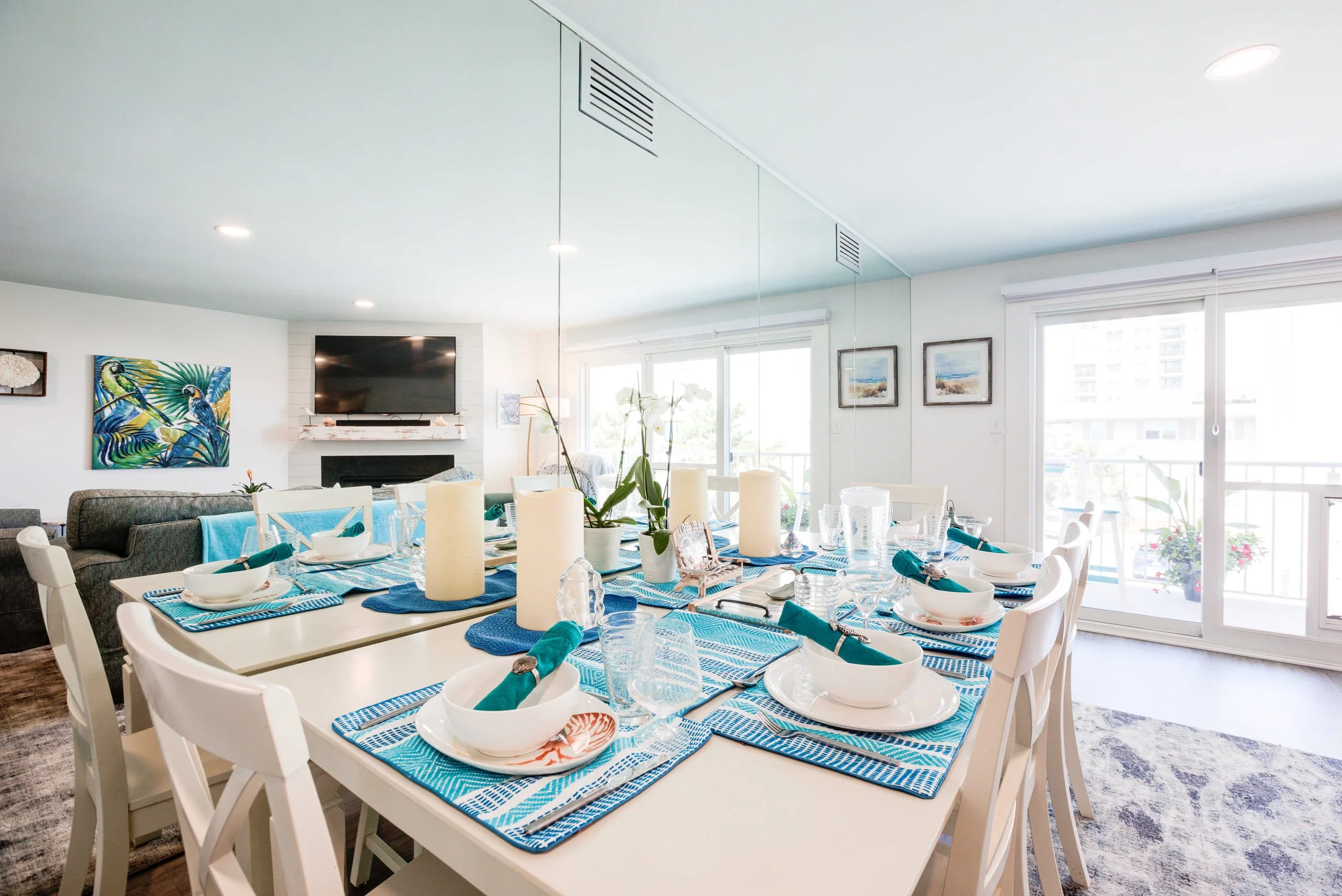The condo had great bones but the overall dated 80’s vibe needed to go. The entire condo was gutted and a full Reno added new waterproof flooring, a contemporary kitchen and bathrooms, new doors and closets, new fireplace, shiplap and mantel, new window treatments, new furniture, rugs and styling. The main room mirror remained so as to maintain the ocean reflection within and keeping the spacious feeling in the main room. Great midtown location by the ocean and a short walk over to the bayside Fagers’ Island resort. Bright airy white, charcoal and turquoise coastal accents.