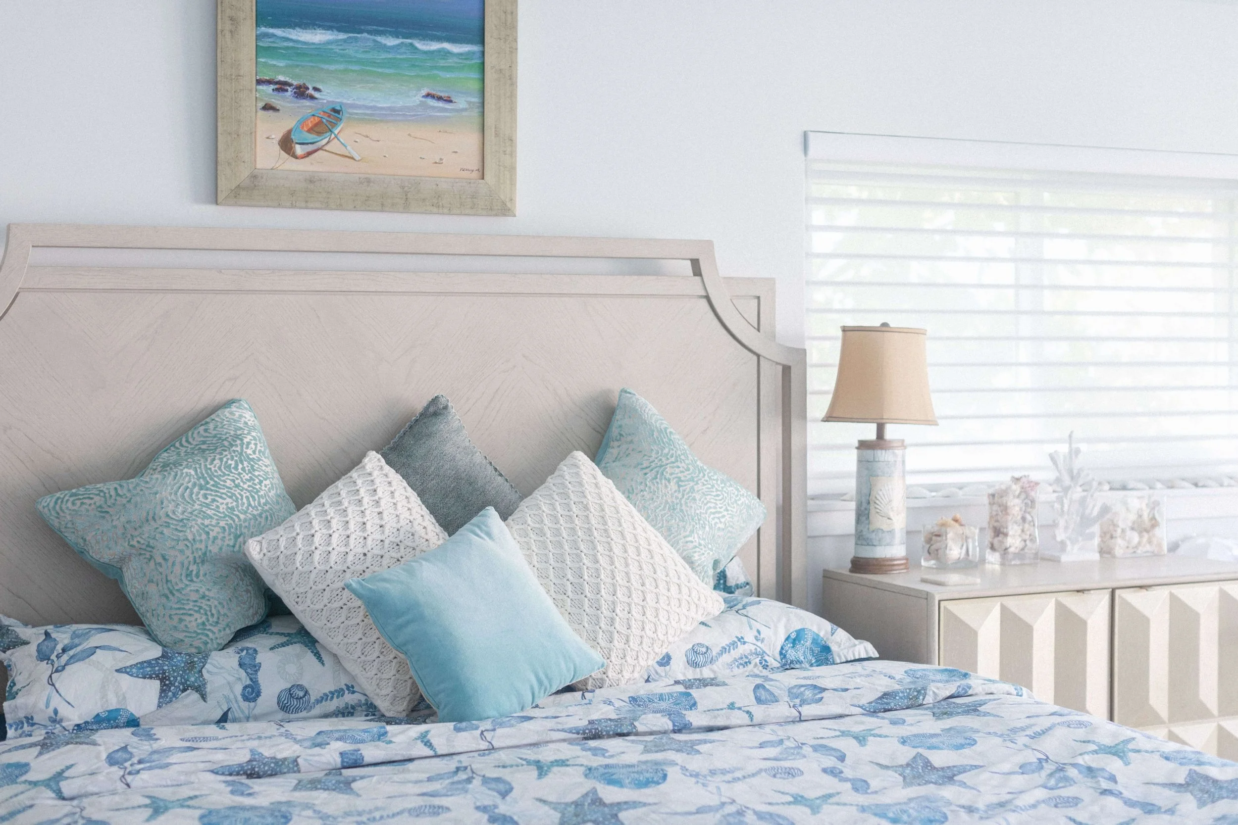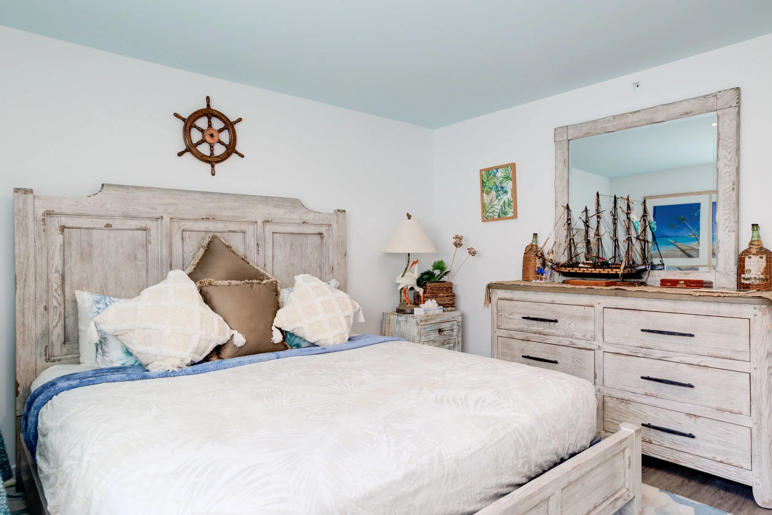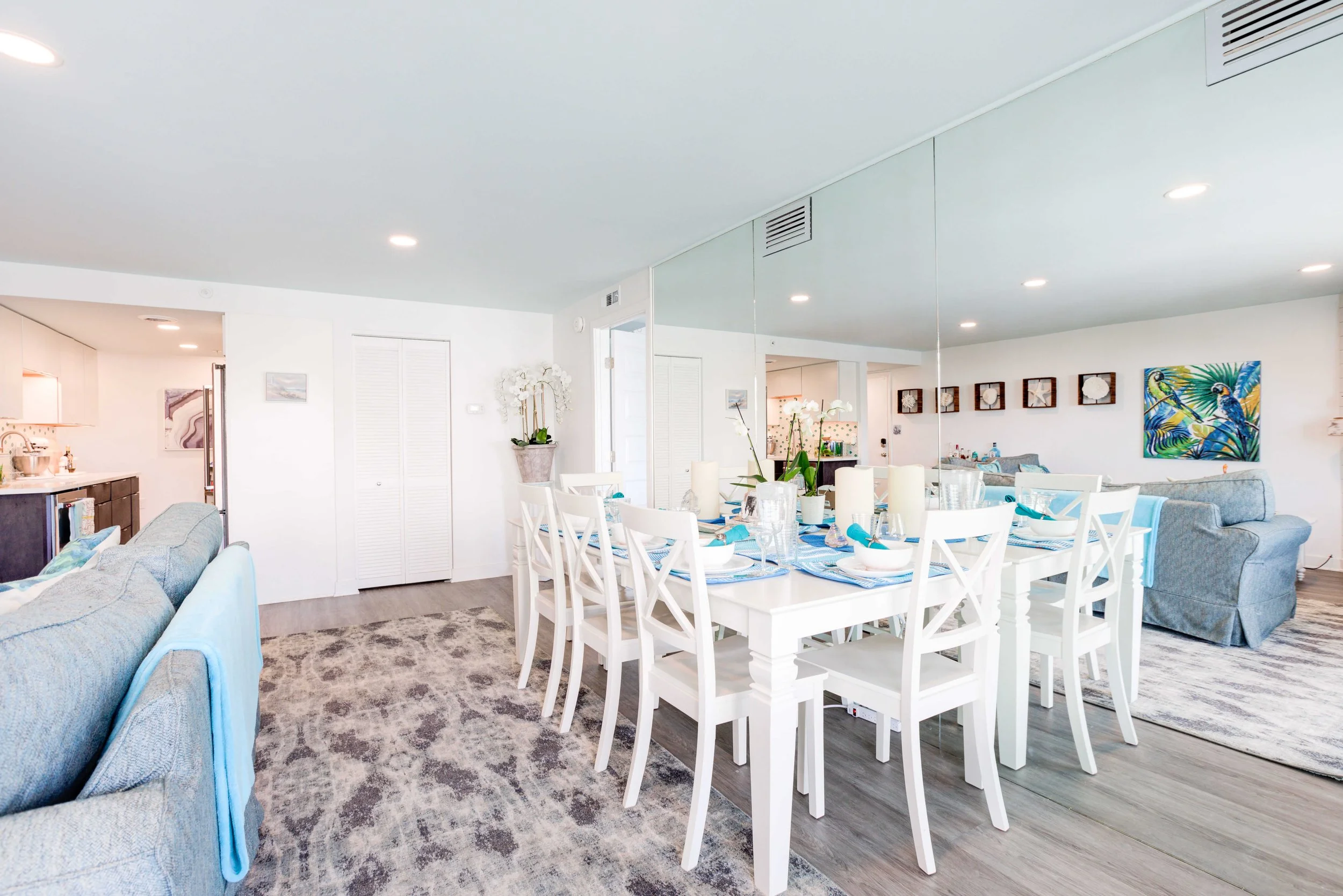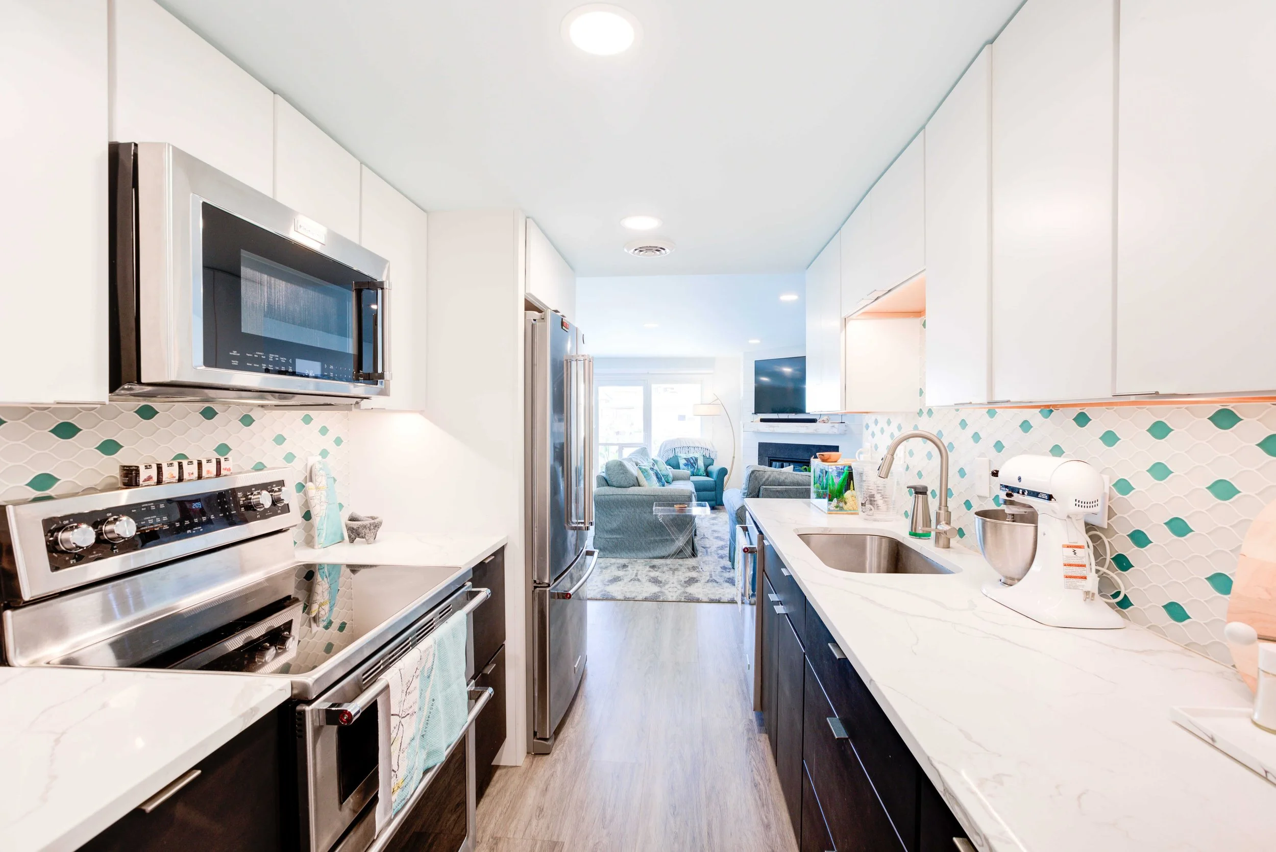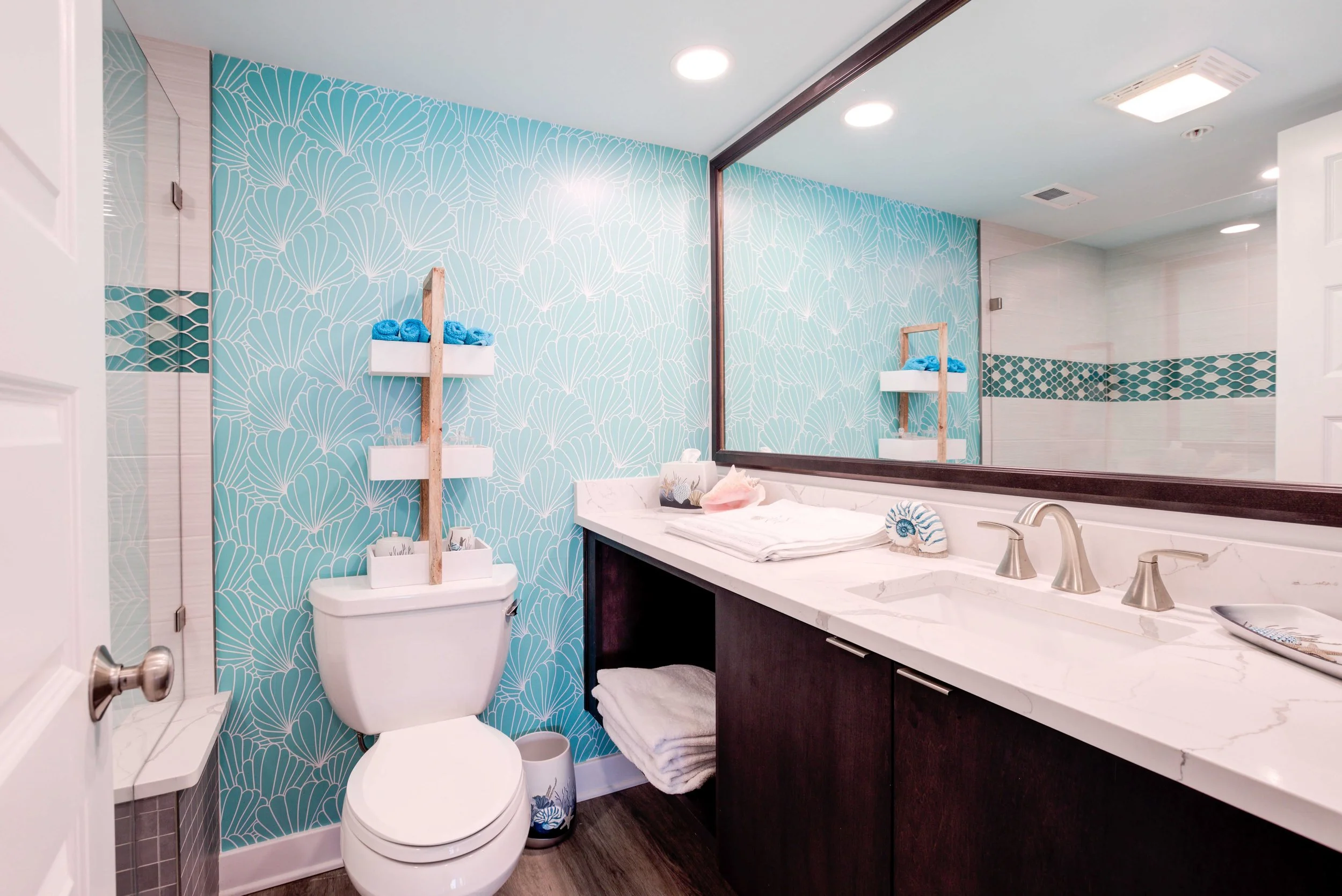 The condo had great bones but the overall dated 80’s vibe needed to go. The entire condo was gutted and a full Reno added new waterproof flooring, a contemporary kitchen and bathrooms, new doors and closets, new fireplace, shiplap and mantel, new window treatments, new furniture, rugs and styling. The main room mirror remained so as to maintain the ocean reflection within and keeping the spacious feeling in the main room. Great midtown location by the ocean and a short walk over to the bayside Fagers’ Island resort. Bright airy white, charcoal and turquoise coastal accents.