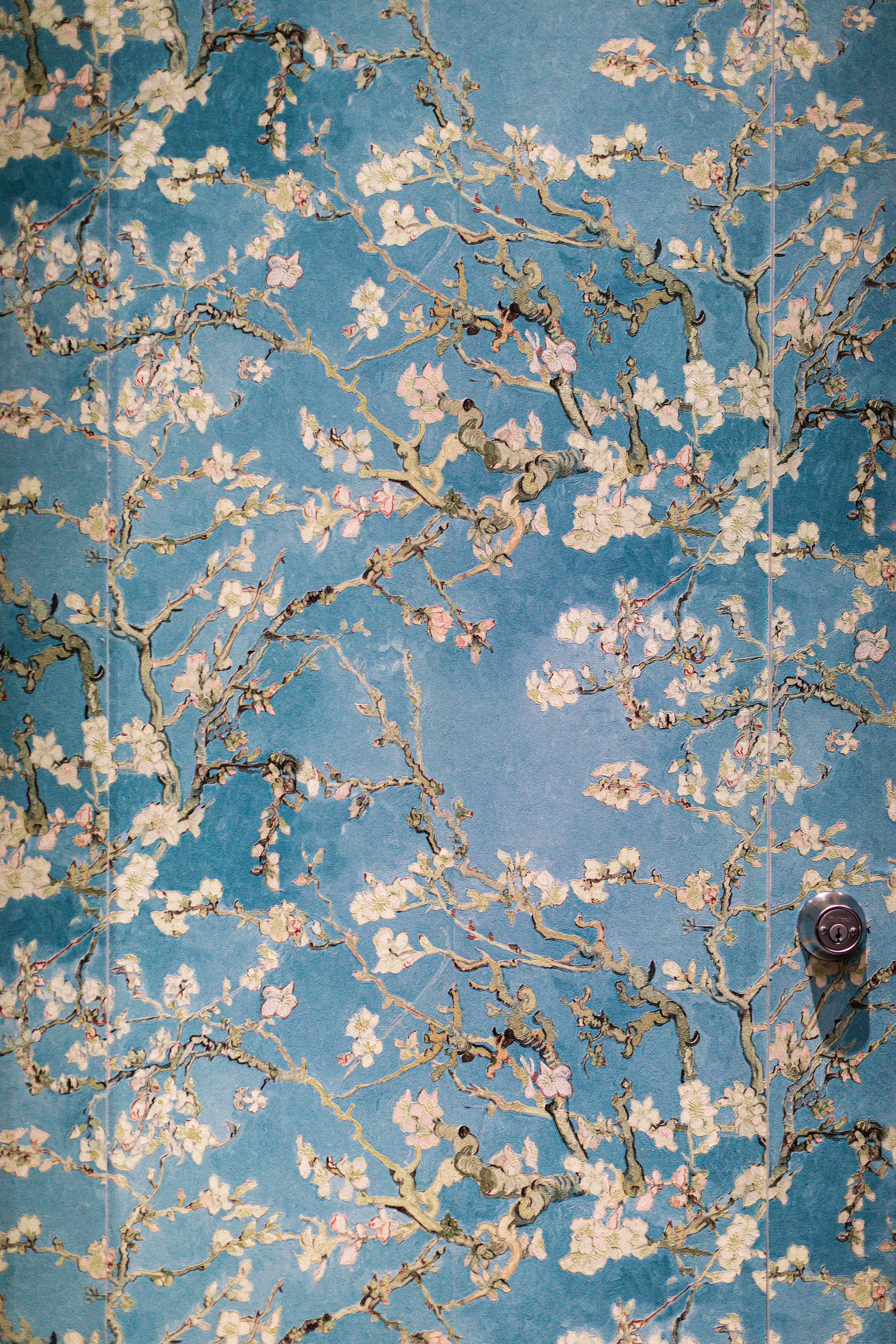 Infusing the salon with the timeless allure of Van Gogh’s Almond Blossom wallpaper.
